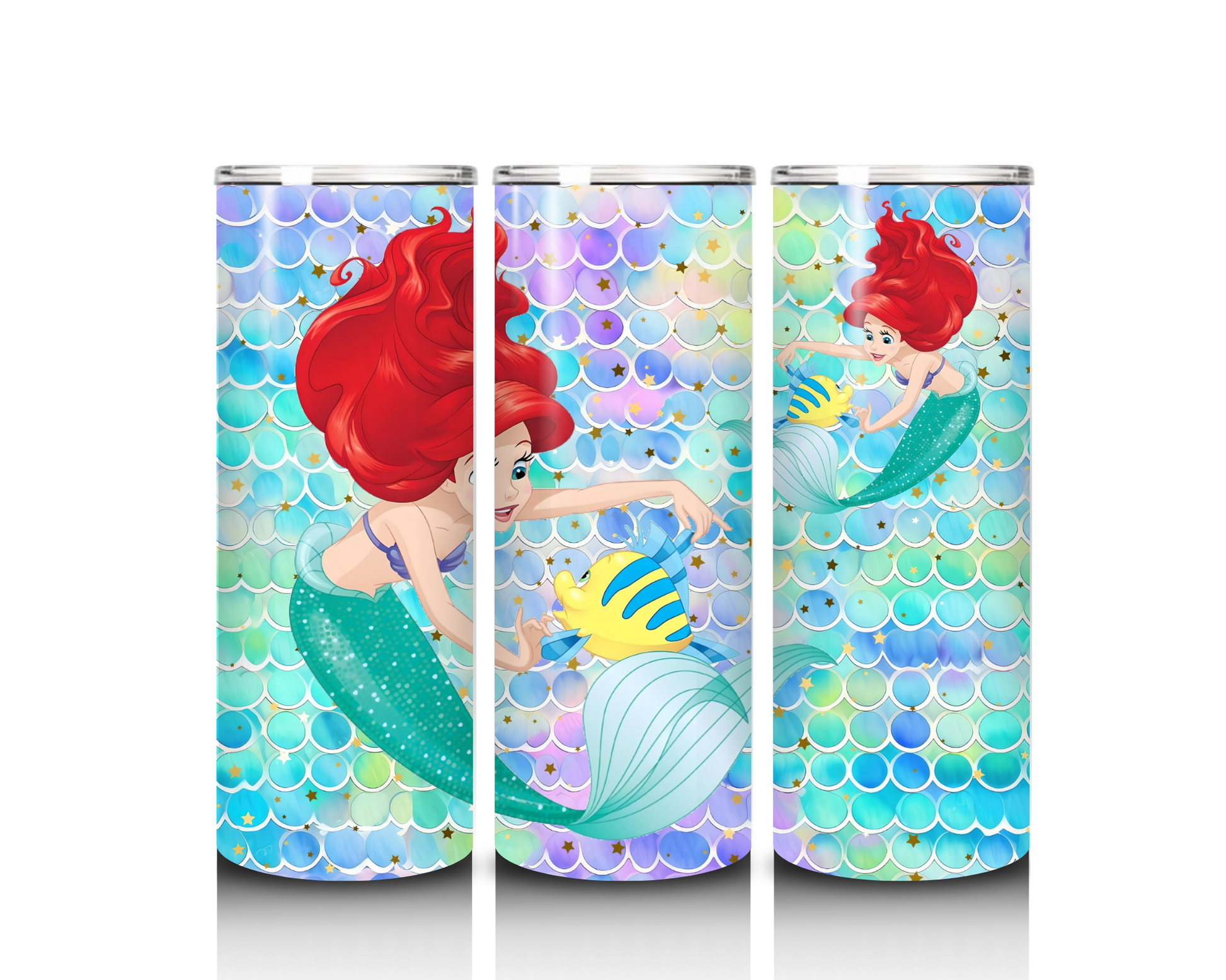 Make a splash with this 20 oz Ariel and Flounder Tumbler! Perfect for any Disney fan, this tumbler features everyone's favorite mermaid and her trusty sidekick. Stay hydrated and show off your love for The Little Mermaid with this fun and playful tumbler.