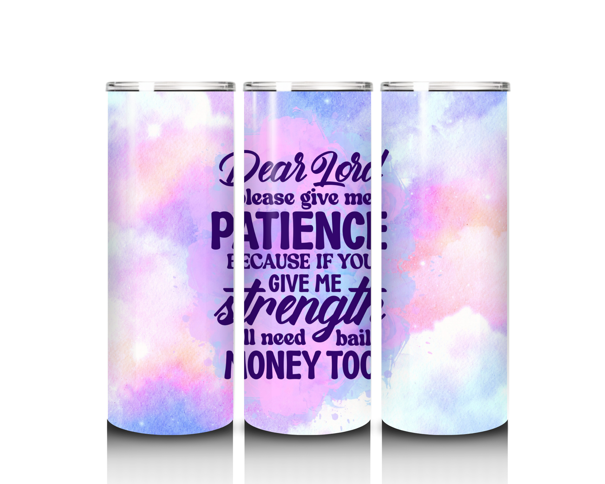 20 oz Dear Lord, Please Give Me Patience, Because if you give me strength, I will also need bail money Tumbler.
