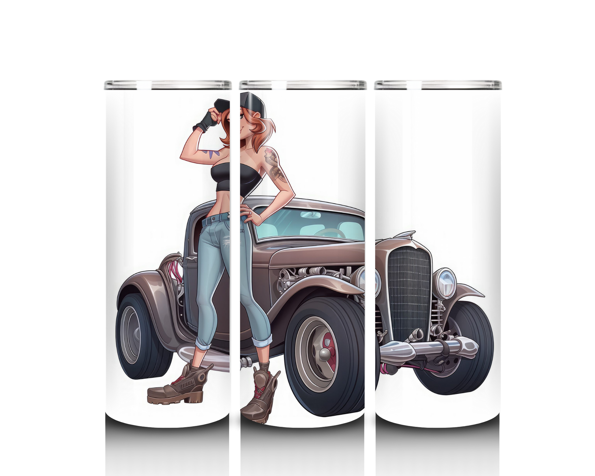 This sassy 20 oz hot rod tumbler is perfect for the mechanic on the go! The sleek red design with a fiery red head will make you stand out at the garage. Keep your drinks hot or cold while showing off your love for cars. (Vroom vroom!)