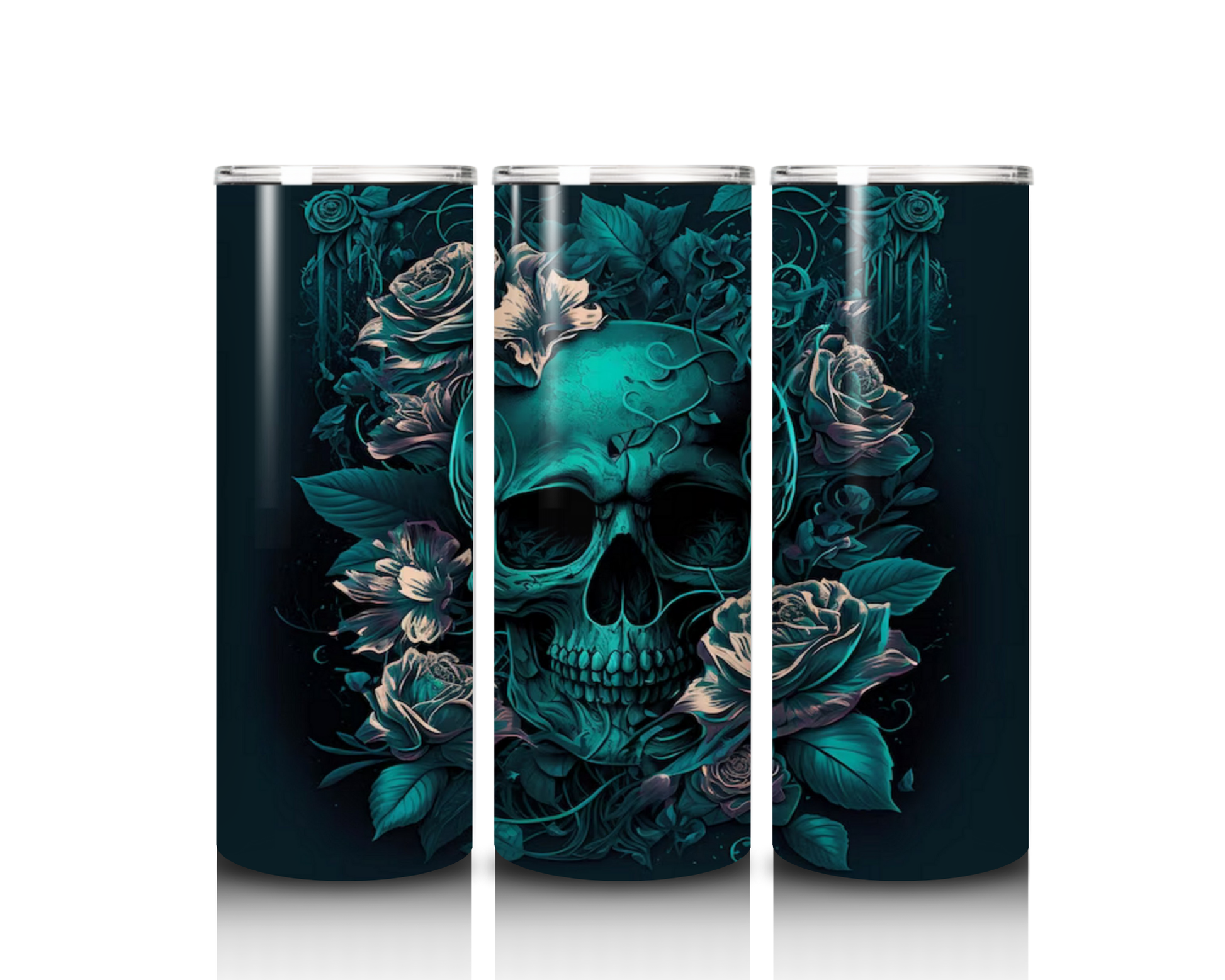 This precision-crafted tumbler features a striking teal skull design adorned with delicate floral elements. The durable construction maintains optimal temperature for both hot and cold beverages, while the ergonomic shape ensures comfortable handling. Perfect for those who appreciate distinctive drinkware with a touch of edgy elegance.